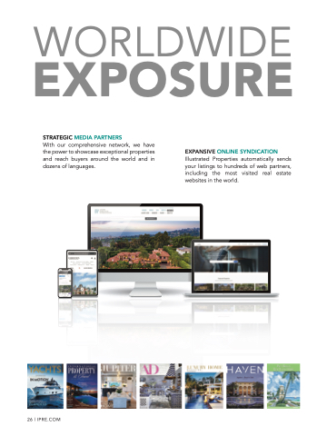 With our comprehensive network we have the power to showcase exceptional properties and and reach buyers around the world and and in dozens of languages EXPANSIVE ONLINE SYNDICATION Illustrated Properties automatically sends your listings to hundreds of web partners including the most visited real estate websites in the world 26 | IPRE COM