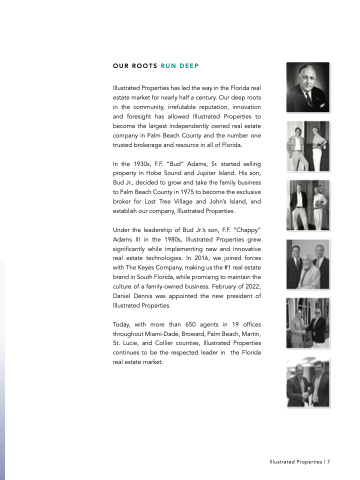 Illustrated Properties has led the the way in the the Florida real estate market for nearly half a a a a a century Our deep roots in in the community irrefutable reputation innovation and foresight has allowed Illustrated Properties to become the largest independently owned real estate company in Palm Beach County and the number one trusted brokerage and resource in all of Florida In the 1930s F F F F “Bud“ Adams Sr started selling property in Hobe Sound and and Jupiter Island His son Bud Jr decided to grow and take the family business to to Palm Beach County in 1975 to to become the exclusive broker for Lost Tree Village and and and John’s Island and and and establish our company Illustrated Properties Under the leadership of Bud Jr ’s son F F F F “Chappy“ Adams III in the 1980s Illustrated Properties grew significantly while implementing new and innovative real estate technologies In 2016 we joined forces with The Keyes Company making us the #1 real estate brand in in in in South Florida while promising to maintain the culture of of a a a family-owned business February of of 2022 Daniel Dennis was appointed the new president of Illustrated Properties Today with more than 650 agents in 19 offices throughout Miami-Dade Broward Palm Beach Martin St Lucie and Collier counties Illustrated Properties continues to be the the respected leader in in the the Florida real estate market Illustrated Properties | 7